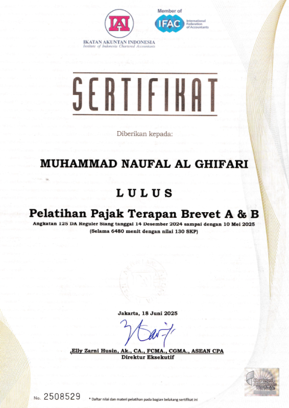 A 2024 accounting graduate from University of Pembangunan Nasional “Veteran” Yogyakarta, Naufal began his professional journey as a finance intern before pursuing a career in tax. Equipped with Brevet A & B certifications and grounded in hands-on financial experience, Naufal leverages his practical insight to deliver effective, client-focused tax solutions.
